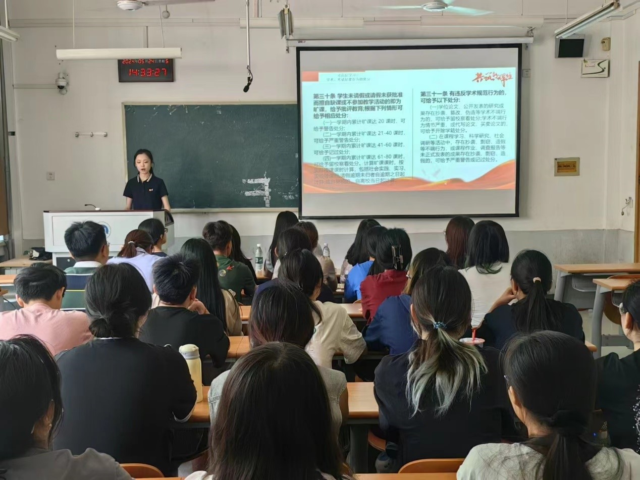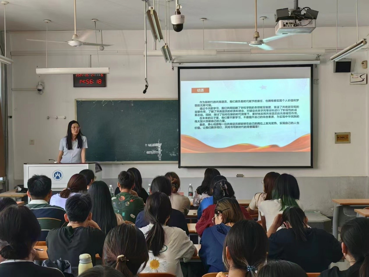 为扎实推进学院学风建设,促进学生成长成才,5月24日下午,我院2022级新闻学专业2班团支部举办“遵守校规校纪,培养良好学风”主题团日活动。本次活动邀请到校团委副书记邢夏子、学院党委副书记王恩娟、学院团委书记杜淑艳、22级辅导员李霞莅临指导。朱宝儿同学担任本次活动主持人。
