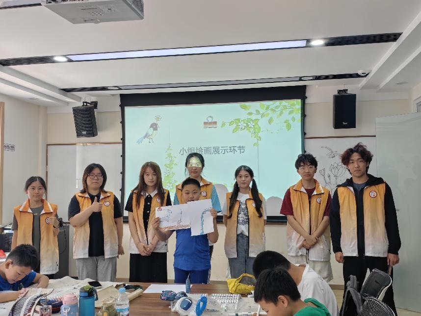 在八名志愿者细致的指导下,小学生们画出了“松树”“岩石”“荷花”“蜻蜓”“长河”“老翁”等意象,孩子们天真活泼,对诗词绘画的热情饱满,并在课堂结束后展示出了自己的绘画。为鼓励孩子们的热情参与,志愿者们为每一位小学生都发放了小奖品,真正做到在课堂上“寓教于乐”,激发了孩子们对诗词文化的兴趣。