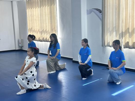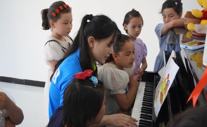 支教工作正式展开后,心手相连队深入社区,与同学们建立了深厚的情感联系。在石榴籽音乐室里,悠扬的琴声吸引了苏麦耶小朋友的注意,她跟着琴声哼唱起来,清脆的童声瞬间拉近了彼此的距离。