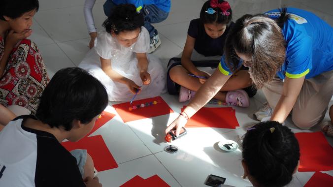 在舞蹈教室里,苏麦耶教大家跳维吾尔族舞蹈《快乐地跳吧》,欢快的旋律和灵动的舞姿让每个人都沉浸在纯真的快乐中。除了音乐与舞蹈,手工课也成为了同学们最喜欢的课程。在色彩斑斓的手工材料前,同学们和志愿队员们围坐一圈,共同探索着手工制作的奥秘。