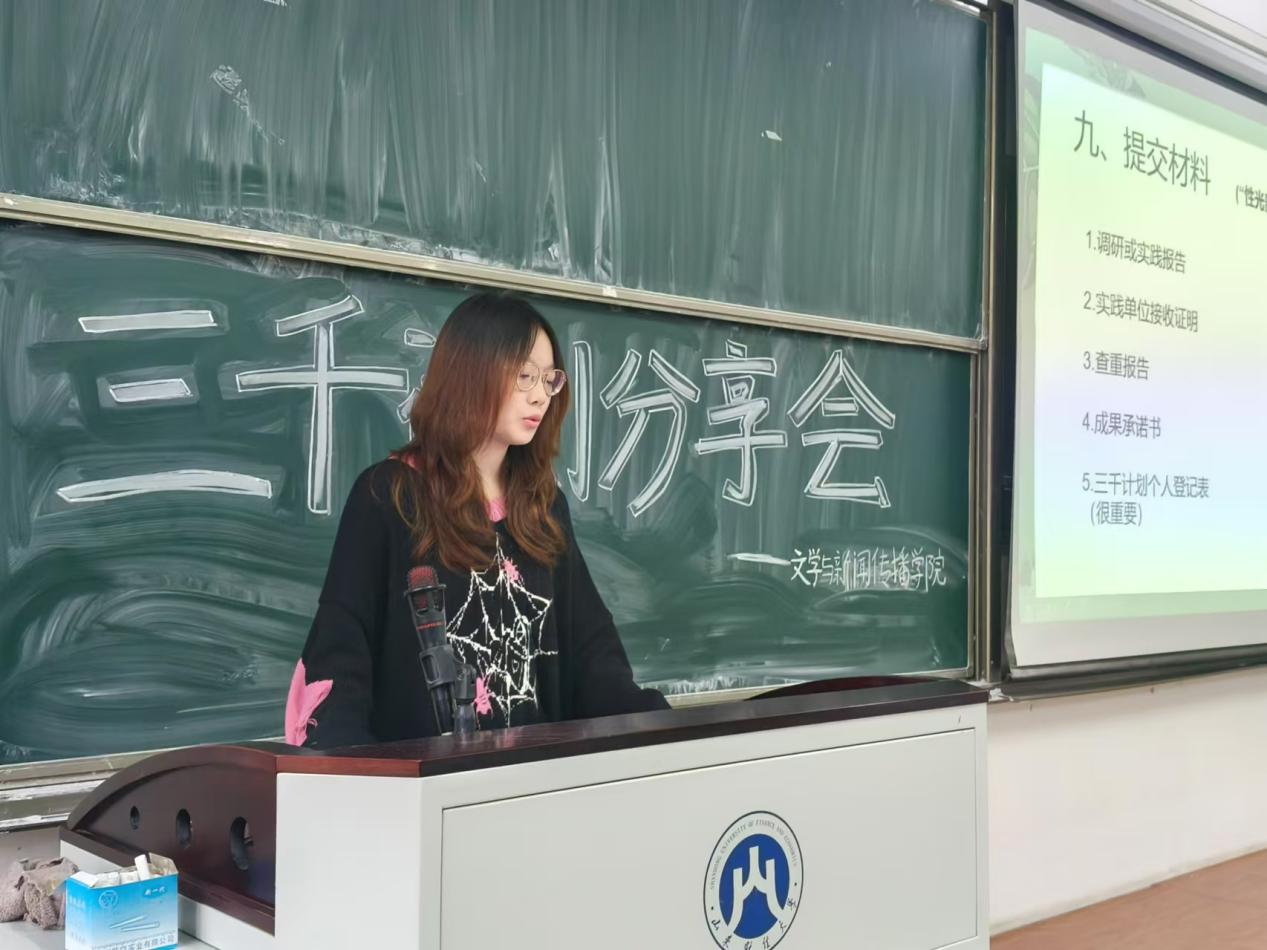 11月14日下午,我院成功举办第二期三千计划分享会。会议由24级汉语言文学一班的李雨洁主持,22级和23级优秀学生代表分享活动经验,24级文化产业管理专业全体学生参会。