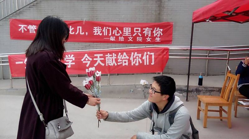 为了丰富我院大学生的校园文化生活,增强学生之间互相尊重与平等交流的观念,我院学生会于第二餐厅门口以自己的方式迎接了3月7日的女生节,主办了专为女同学献花送祝福的创新福利活动。