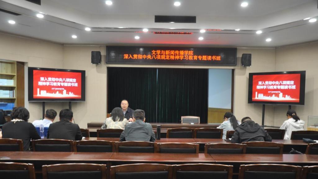 为深入学习领会习近平总书记关于加强党的作风建设的重要论述,进一步推动深入贯彻中央八项规定精神学习教育走深走实,4月10日,学院在诗学讲堂举办深入贯彻中央八项规定精神学习教育读书班。党委书记杜啸尘主持,党委理论学习中心组成员、党支部书记、系部主任参加读书班。