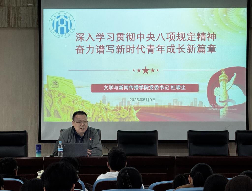 为深入学习贯彻中央八项规定精神,进一步加强学生思想政治教育,5月9日下午,我院党委书记杜啸尘为2024级学生讲授“深入学习贯彻中央八项规定精神,奋力谱写新时代青年成长新篇章”专题党课。
