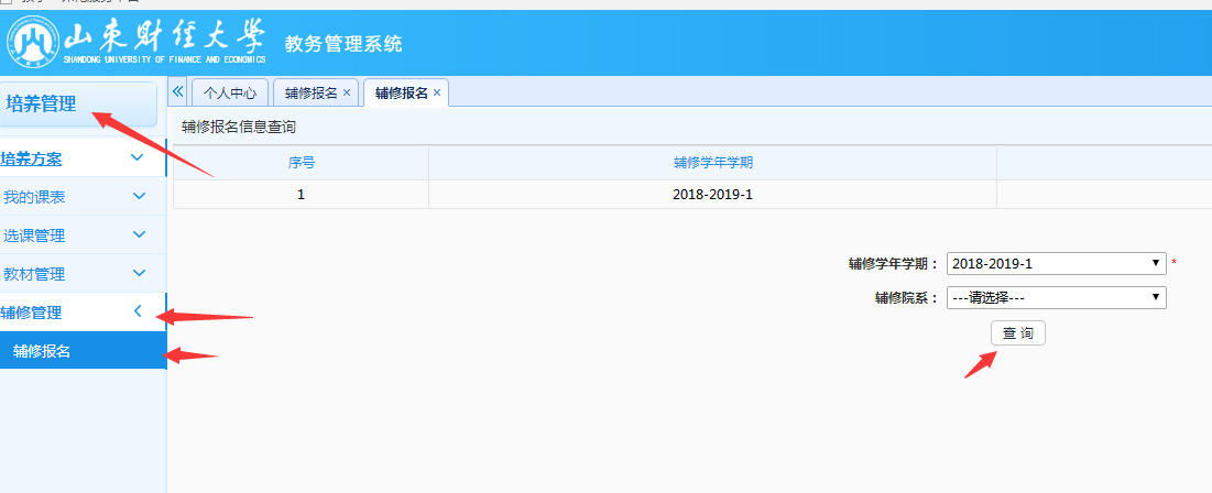 2、登录系统后点击:培养管理—辅修管理—辅修报名:点击‘查询’按钮,查询课报名的辅修专业: