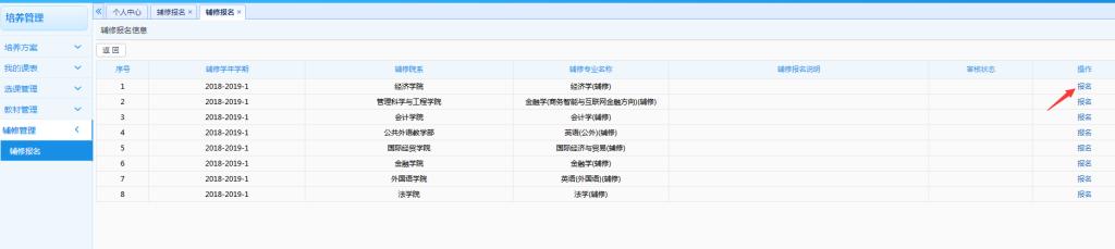 三、点击辅修专业后面的‘报名’按钮(注意:英语专业报名请点公外部这个),完成报名: