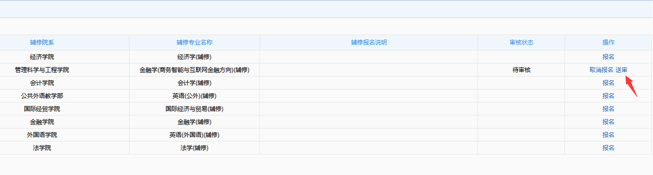 四、报名最后一步,提示报名成功后,点击‘送审’按钮,务必送审到学院负责辅修专业的老师,等待进行报名审核,审核通过后,完成了报名整个过程: