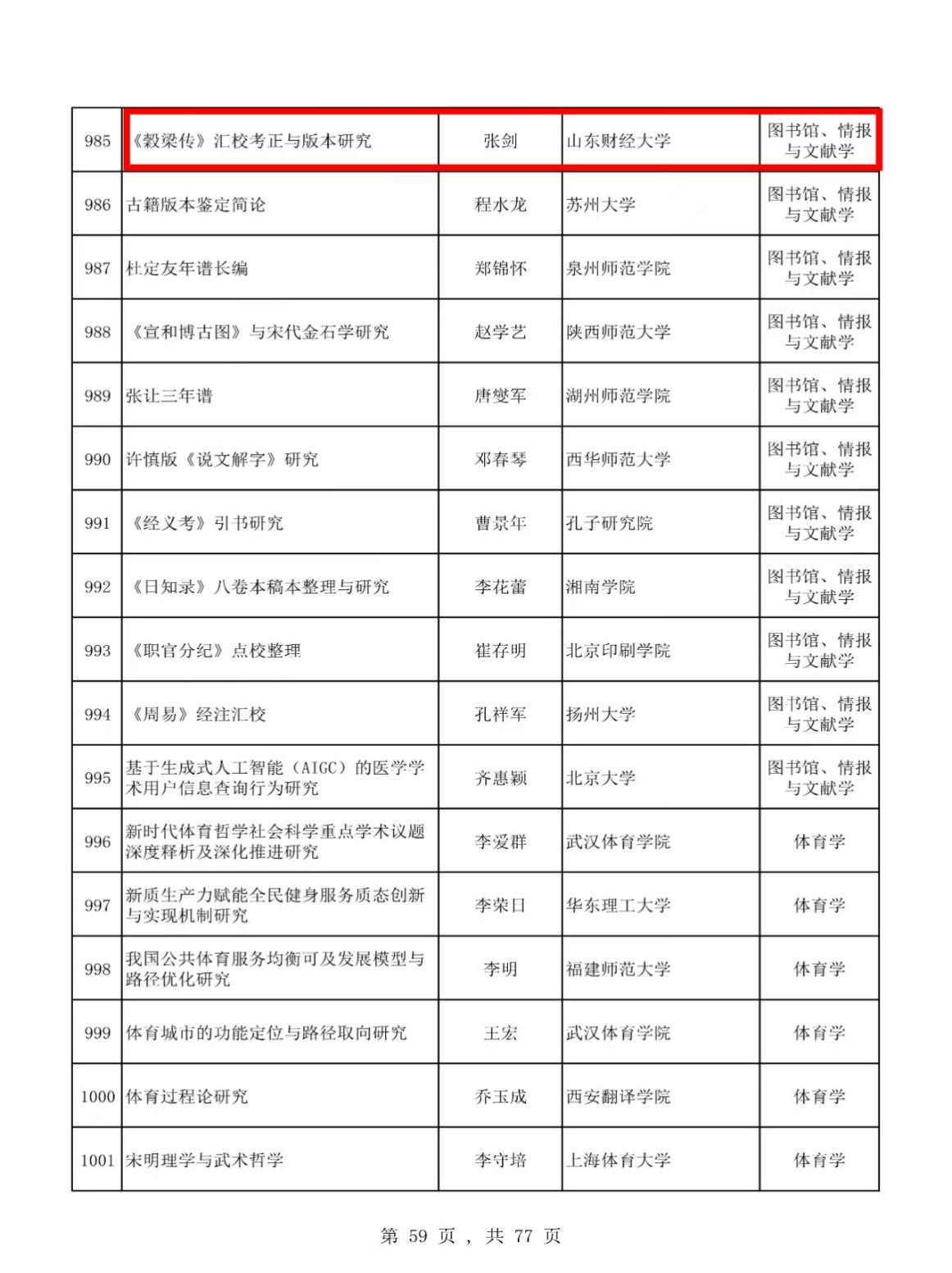 12月17日,全国哲学社会科学工作办公室公布了《2024年国家社会科学基金后期资助暨优秀博士学位论文出版、优秀学术著作再版项目立项名单》(总共立项1304,其中图书馆、情报与文献学立项23),我院张剑老师申报的《〈穀梁传〉汇校考正与版本研究》获批立项。