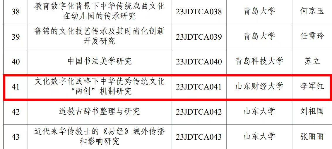12月14日,由教育部社会科学司设立的中华优秀传统文化专项课题(A类)评审结果公示,我院李军红教授申报的《文化数字化战略下中华优秀传统文化“两创”机制研究》获重点课题立项。