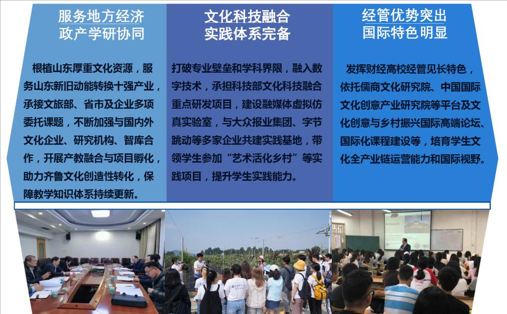专业充分发挥财经类高校比较优势,人才培养凸显经管特色,重视政产学研协同育人,强化应用能力培养,拥有山东省文化产业经营管理研究基地、山东省非遗研究基地、国际文化创意产业研究院、儒商文化研究院、乡村文化研究院等多个省级、校级教学科研平台。专业紧跟数智时代发展趋势,与数字文化行业头部企业开展合作,强化数字文化人才培养,注重科研和实践反哺教学,积极服务地方经济,助力齐鲁文化创造性转化,先后承担国家社科基金项目4项,科技部国家重点研发计划文化科技融合项目1项,教育部人文社会科学研究项目等十余项,参加全省文化经济发展重大课题-文化创意产业专题调研工作,参加省委宣传部、省文旅厅《山东省十四五文化旅游规划》及济南、潍坊、菏泽、威海等地市十四五文旅规划部分编写工作,系列成果有力支撑了教学工作。专业立足新文科建设,不断推进专业教育与创新创业教育融合,学生获奖和就业工作成绩斐然,近五年,在“互联网+”大学生创新创业大赛、“挑战杯”大学生创业计划竞赛等各类学科竞赛中不断取得佳绩,学生升学、考公等高水平就业率稳定在30%-40%左右,多名学生被中国传媒大学、伦敦大学国王学院等国内外文化产业专业顶尖高校录取。