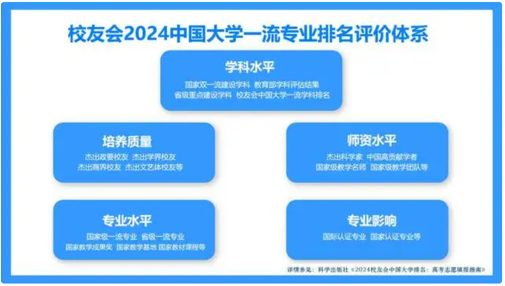 校友会2024中国大学一流专业排名评价指标由学科水平、培养质量、师资水平、专业水平和专业影响等5大指标构成,以艾瑞深大学360度全景数据平台为数据支持,涵盖教育部双一流建设学科、国家级一流本科专业建设点等100多项核心评价指标,全国共1226所本科高校的近6万个本科专业上榜。