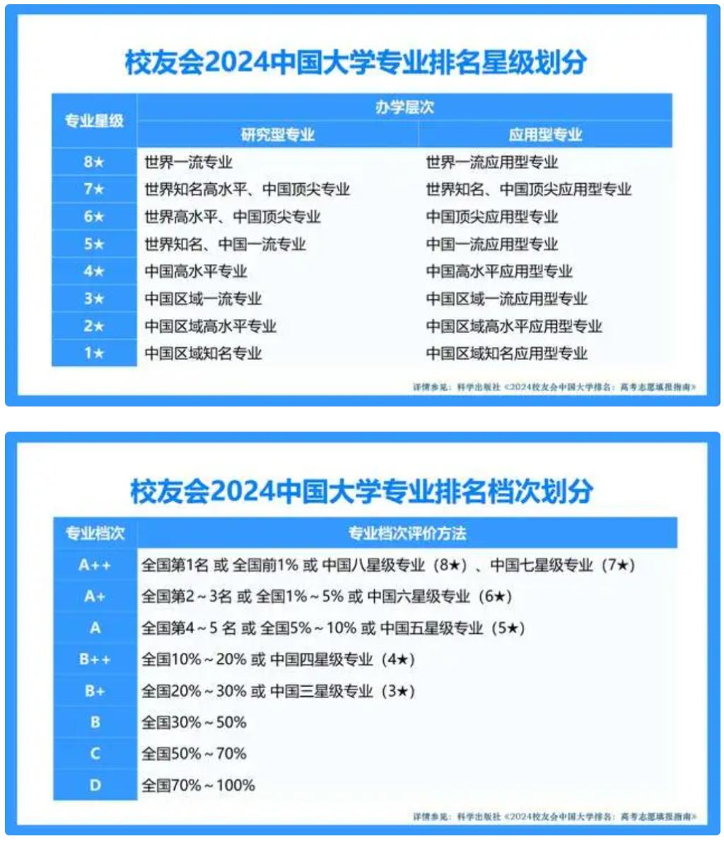 校友会中国大学一流专业排名首发于2015年,至今已有10年的历史,是目前中国参评高校数量最多、参评专业规模最大的中国大学本科专业排名,每年由艾瑞深校友会网(Cuaa.net)撰写、科学出版社公开出版发行的当年度《校友会中国大学排名:高考志愿填报指南》,日益成为全国考生高考填报志愿的权威参考。校友会中国大学专业排名坚持实施分类分级分档评价,按“研究型”和“应用型”2个类型进行分类评价;2022年起,在校友会中国大学专业星级评价基础上,将中国大学专业分为A++、A+、A、B++、B+、B、C和D等8个档次进行分档评价。