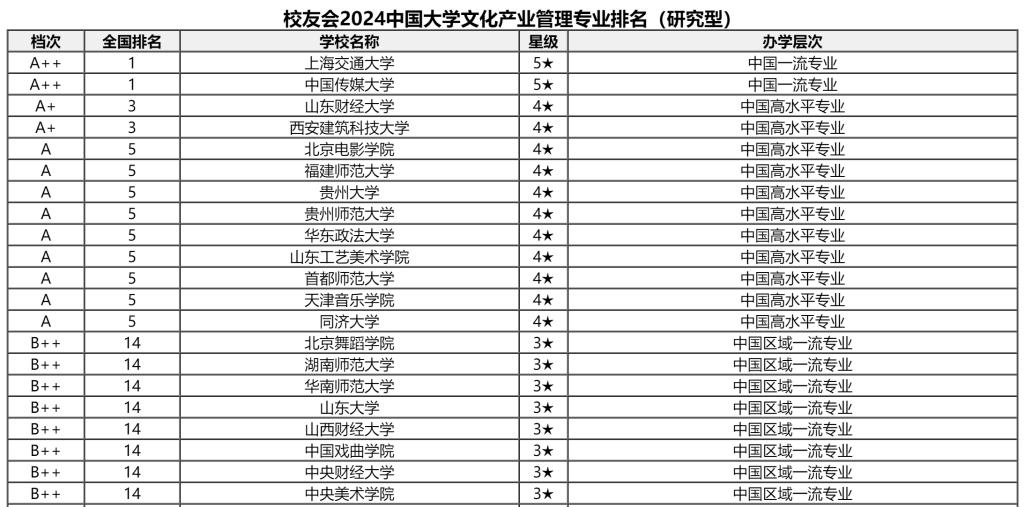 近日,备受瞩目的校友会2024中国大学一流专业排名发布,在最新文化产业管理专业排名(研究型)中,我院文化产业管理专业获评“4★,A+”层次,在全国近两百所开设该专业的院校中位列第三,继续保持国内领先优势。